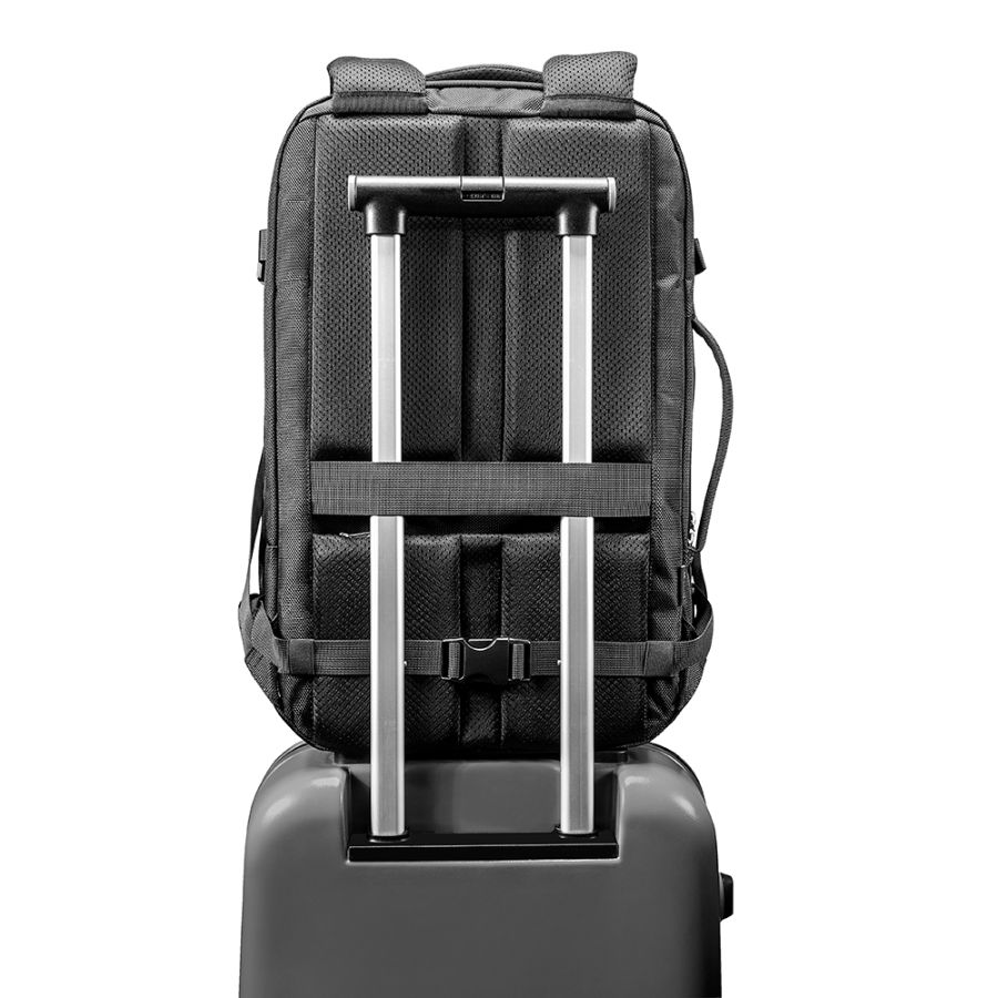 Mặt sau balo tích hợp thêm dây đai thun để dễ dàng cố định vào cần kéo vali.