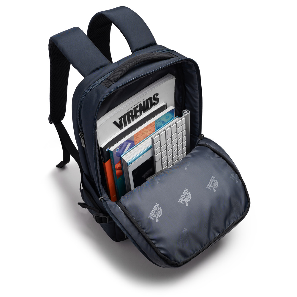 Mặt trước balo đính logo PVC biểu tượng thương hiệu KMORE..