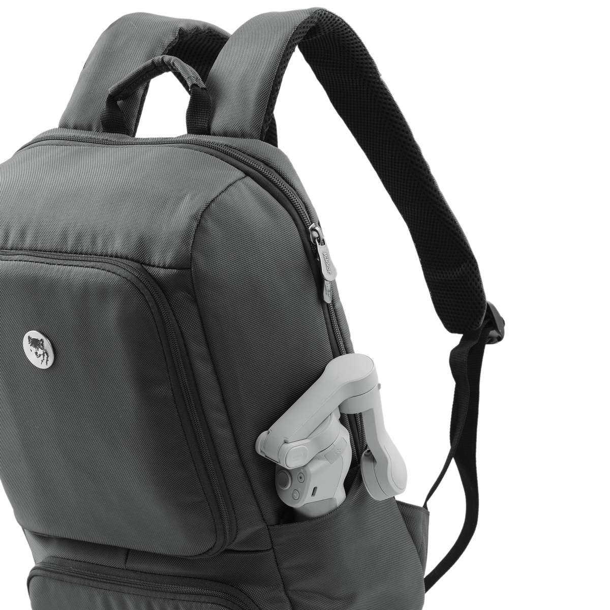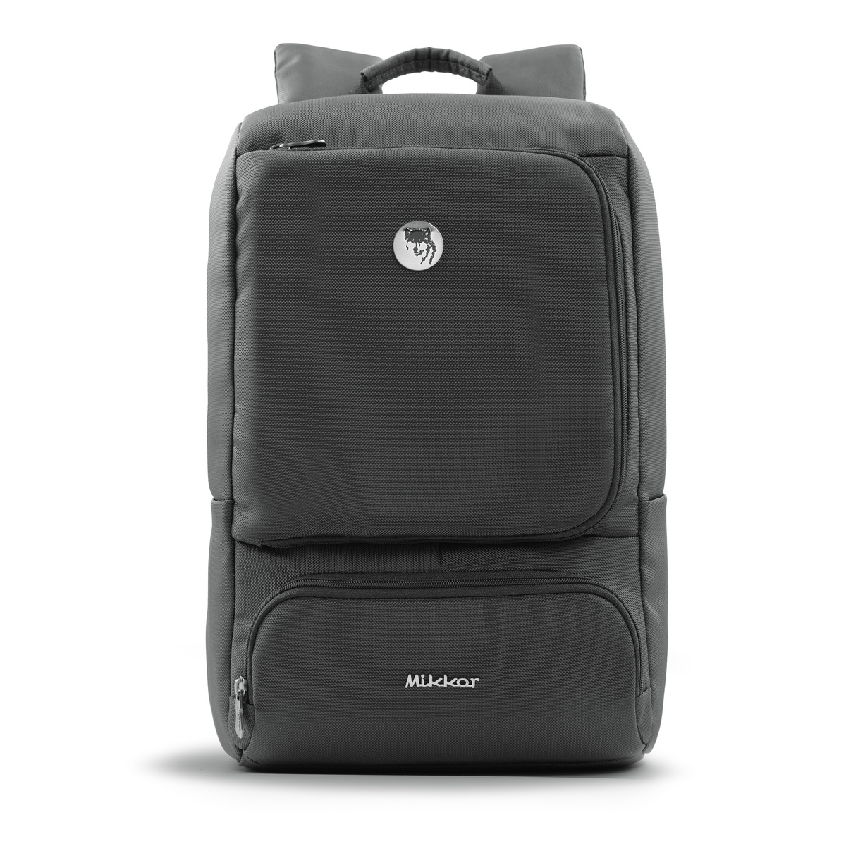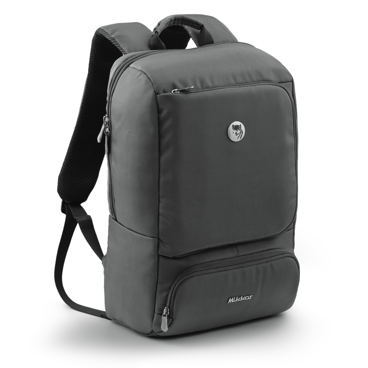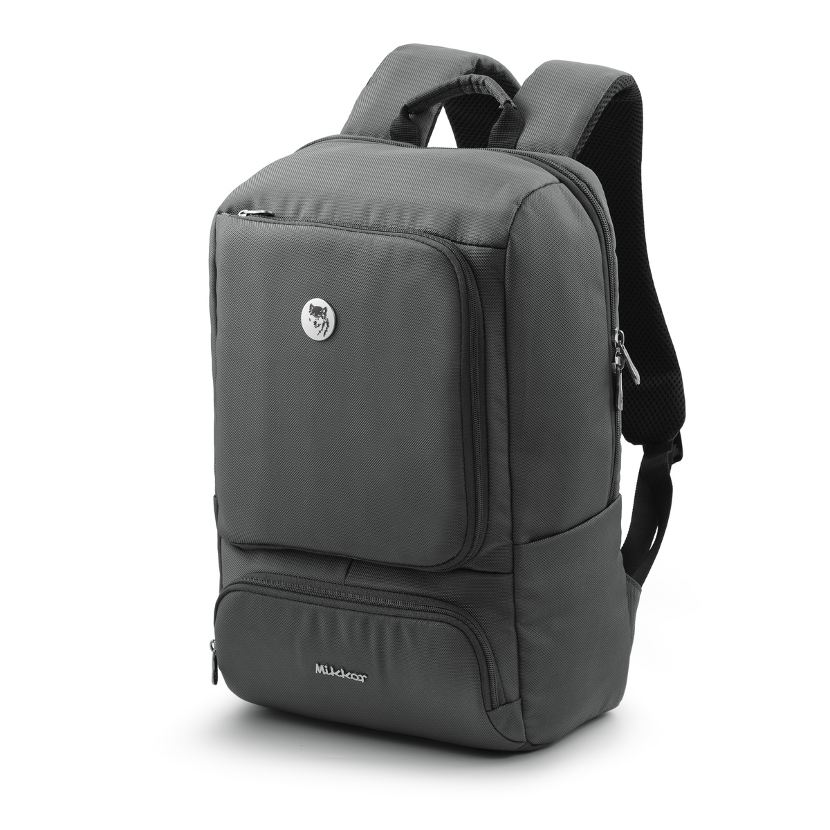 Mặt trước balo đính logo chú sói biểu tượng thương hiệu và logo hợp kim MIKKOR nổi bật.