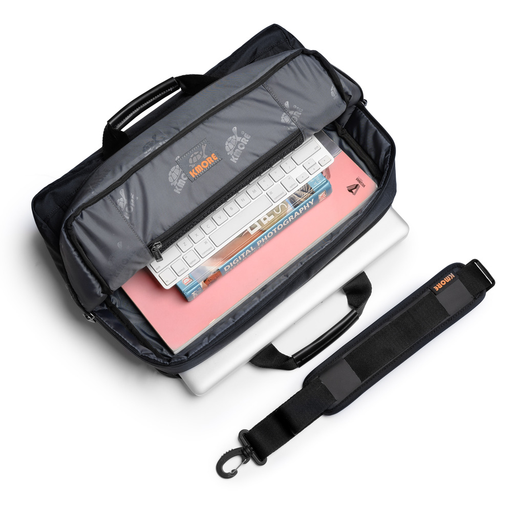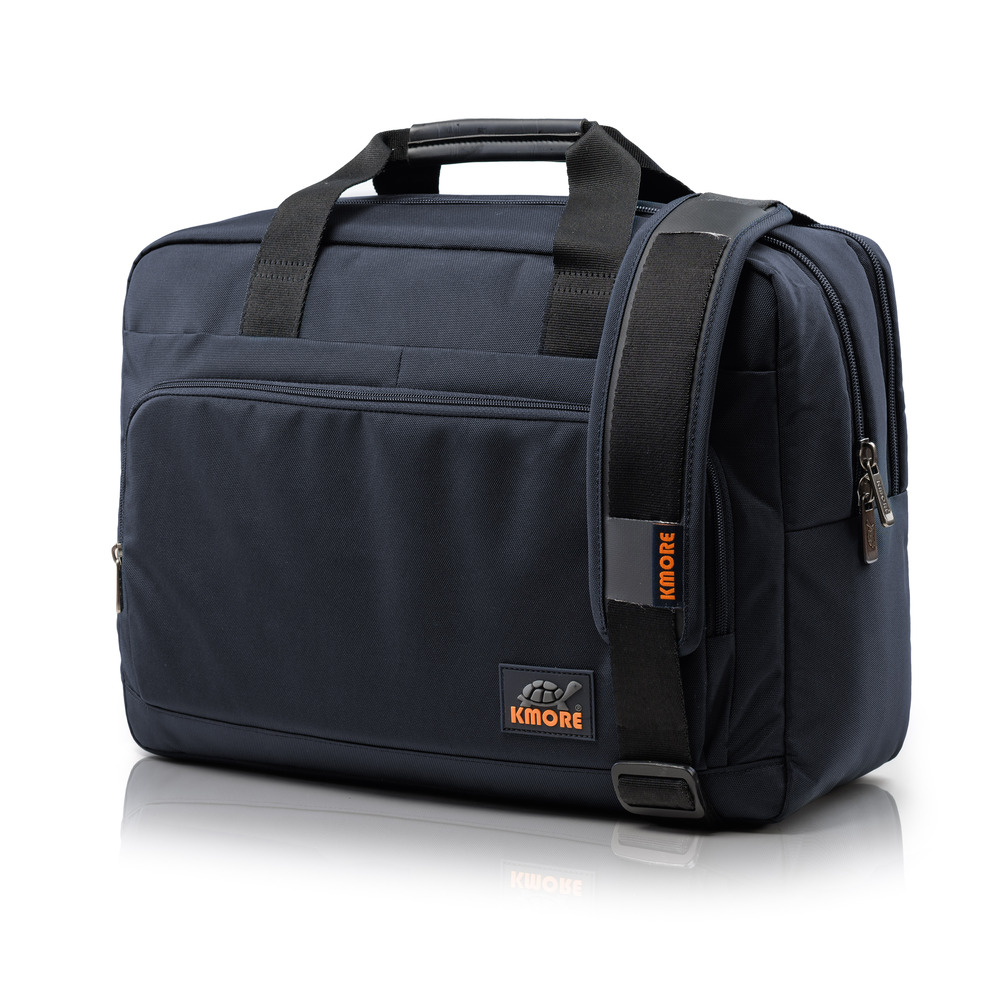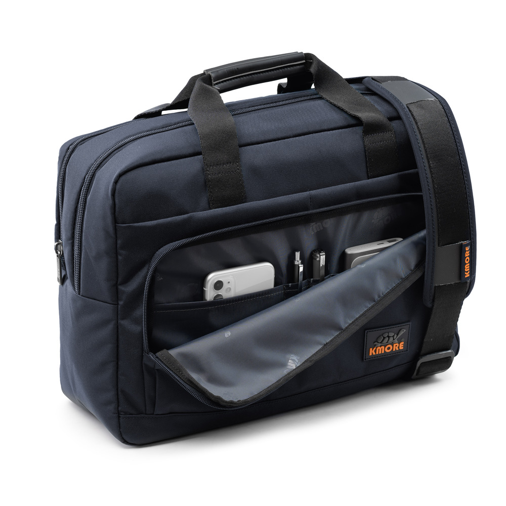 The Enzo Briefcase với 3 màu chủ đạo Black, Navy, Tan được thiết kế trên nền vải 900D Twill Polyester with PU&WR , PU/2T cùng logo thương hiệu Kmore độc đáo.